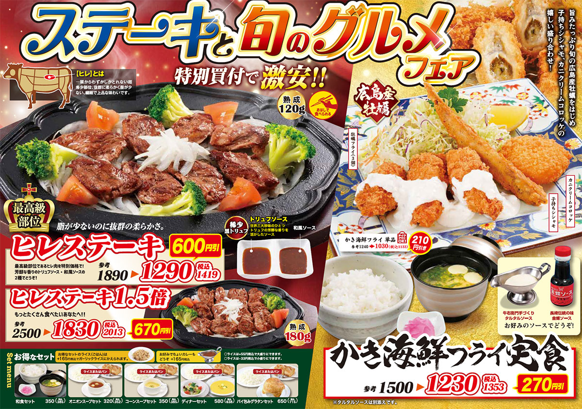 牛右衛門松浦店、牛右衛門カフェで「ステーキと旬のグルメフェア」開催中!by 牛右衛門2025年11月25日2025年11月26日 旨みたっぷり旬の広島産牡蠣をはじめ、子持ちシシャモ、カニクリームコロッケの嬉しい盛り合わせ!かき海鮮フライ定食をご賞味ください!