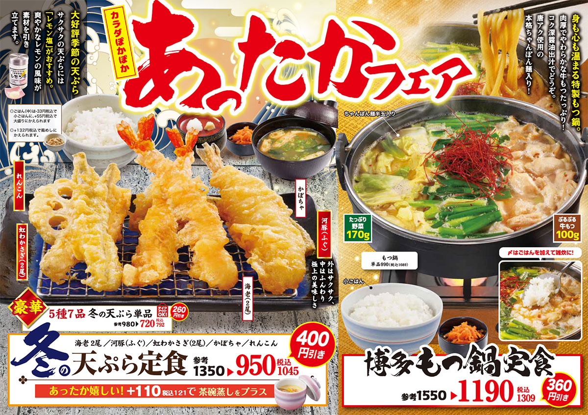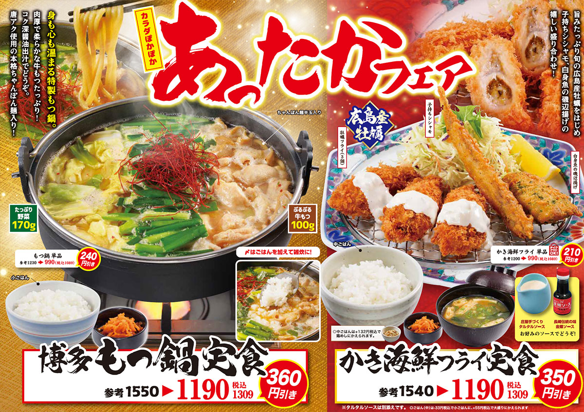 酛蔵(もとくら)庄屋各店で「あったかフェア」開催中!by 牛右衛門2025年11月26日2025年11月26日酛藏庄屋(佐々店、武雄店、大川店、チトセピア店、岩見店) カラダぽかぽか、身も心も温まる特製もつ鍋。肉厚で柔らかな牛もつたっぷり!コク深醤油出汁でどうぞ。唐アク使用の本格ちゃんぽん麺入り! 酛藏庄屋(大塔店)